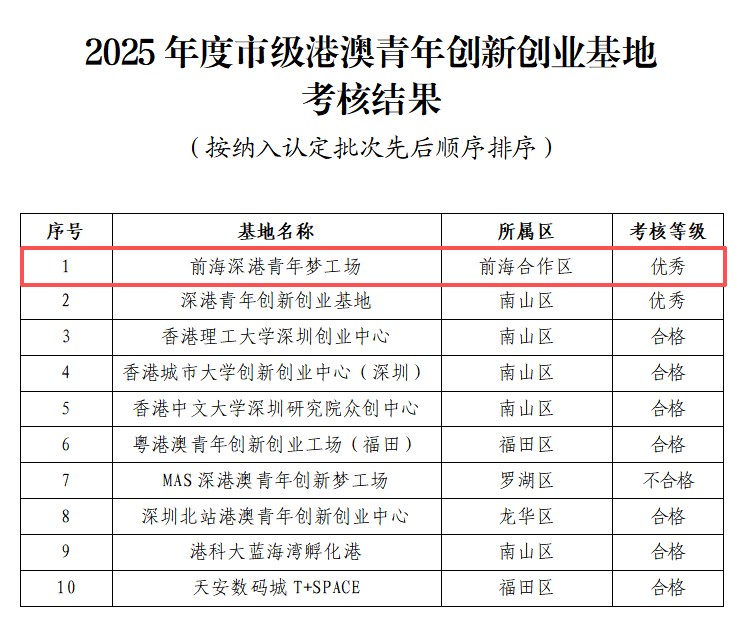 前海深港青年梦工场在2025年度市级港澳青年创新创业基地考核中再次获得“优秀”评级。