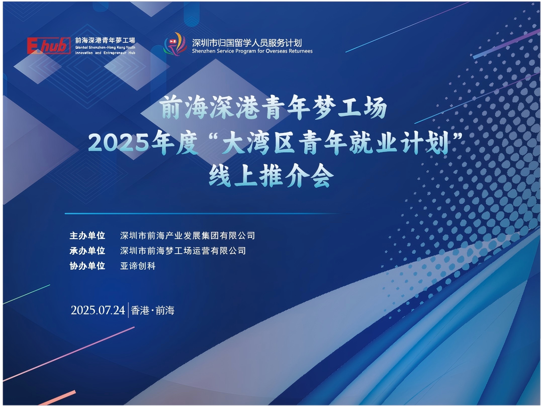 为深化深港青年人才交流合作,精准服务香港青年融入大湾区发展,2025年7月24日下午,由深圳市前海产发集团有限公司主办,深圳市前海梦工场运营有限公司承办,深圳亚谛科技有限公司协办的“前海深港青年梦工场2025年度全面对接大湾区青年就业计划系列活动线上推介会”在前海深港青年梦工场北区直播间成功举行。本次活动通过线上直播形式,聚焦香港特区政府“大湾区青年就业计划”,为香港青年解读政策、推介前海机遇、展示优质岗位,吸引了众多港青线上参与,反响热烈。