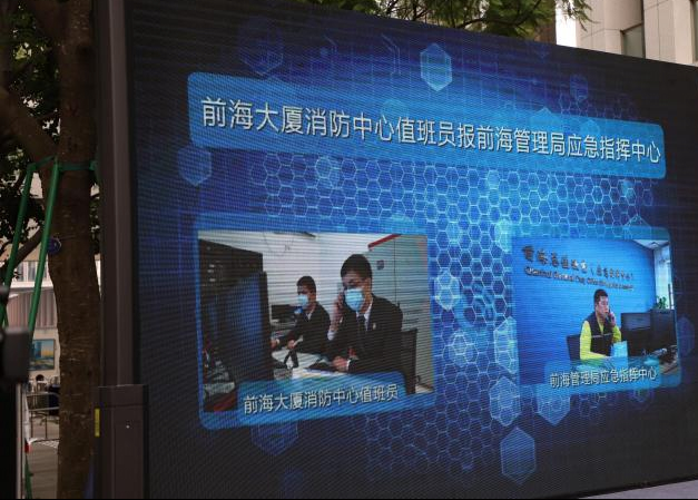 演习中,前海大厦客户服务中心紧急启动企业消防应急预案,及时通知并指挥楼上办公人员紧急疏散。前海管理局接获险情后,立即指示并组织应急体系内各成员单位的救援力量迅速赶赴现场。根据《深圳市前海深港现代服务业合作区管理局突发事件总体应急预案》,此模拟事件为一般(IV级)突发火灾事故。