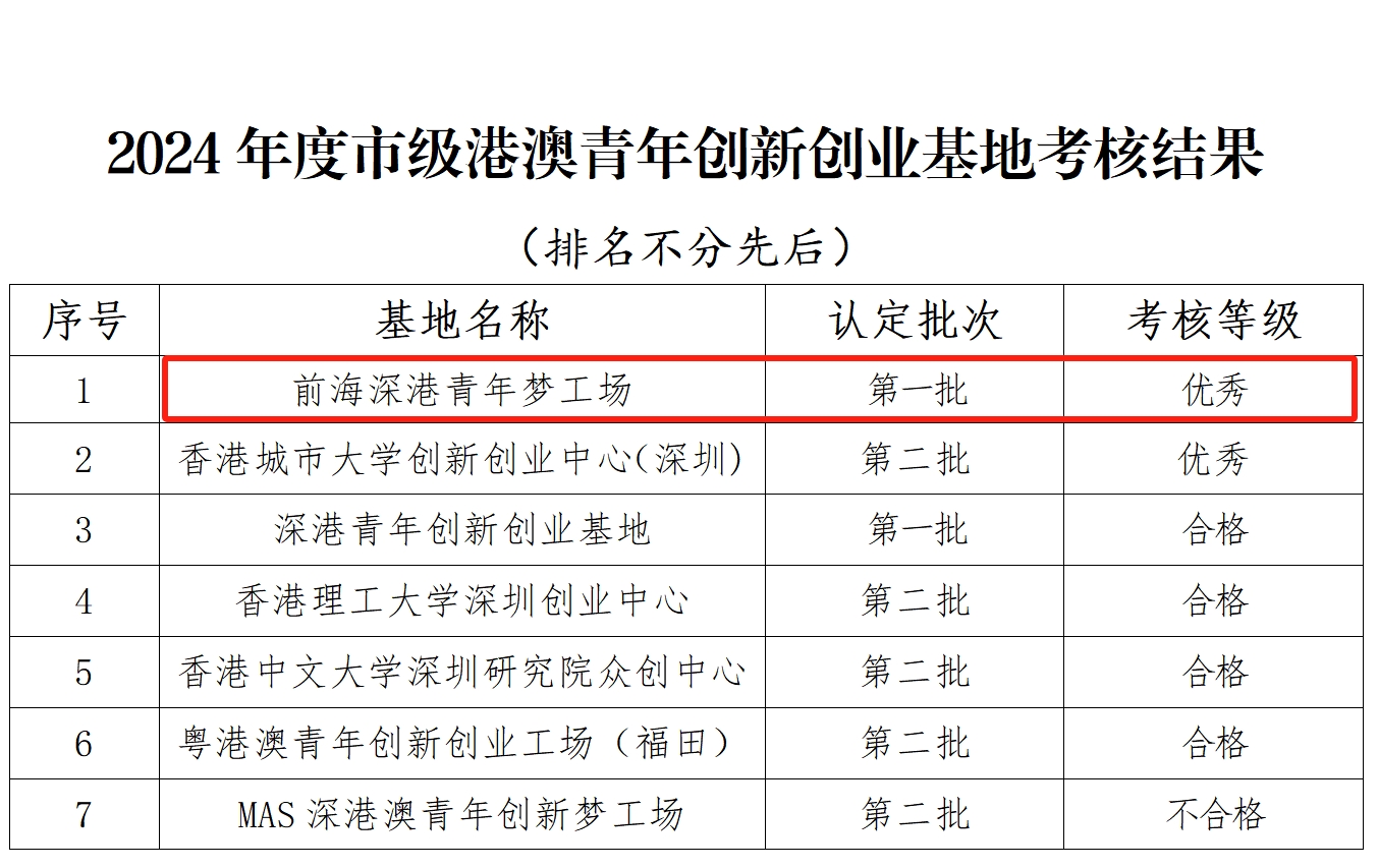 近期,根据《关于推动港澳青年创新创业基地高质量发展实施意见》(深人社规〔2021〕10号)有关规定,2024年度市级港澳青年创新创业基地考核结果公布,梦工场凭借其卓越的运营成果和创新实践,荣获2024年度市级港澳青年创新创业基地考核结果优秀!