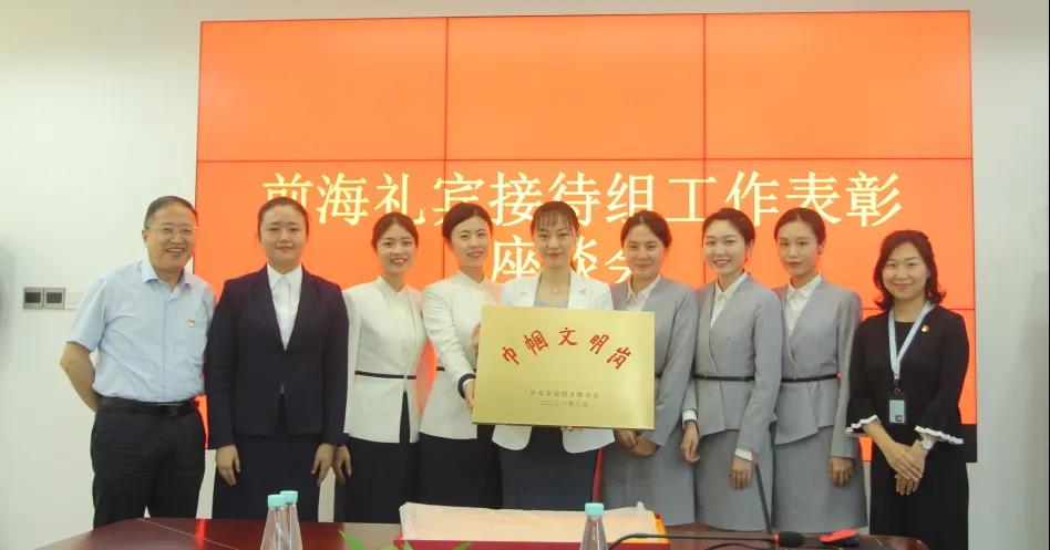 前海管理局机关党委副书记、工会主席杨珊与前海服务集团董事长陈卫为前海礼宾接待组颁发2020年度全国“巾帼文明岗”荣誉称号奖牌