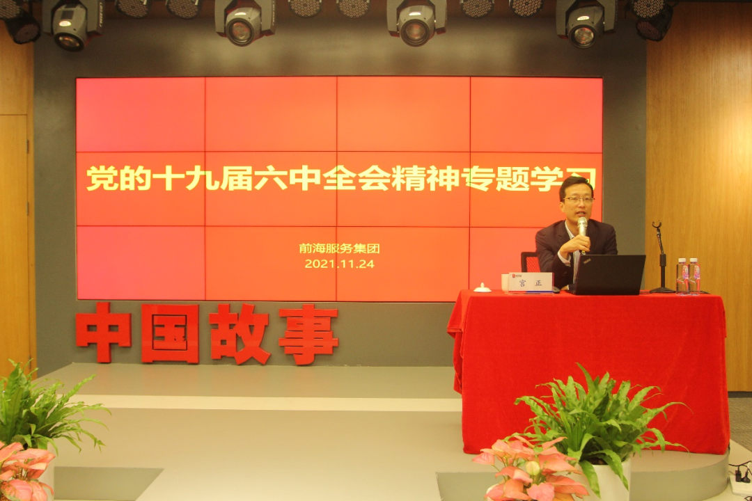 为认真学习贯彻党的十九届六中全会精神,及时做好全会精神的宣传和解读工作,11月24日下午,前海服务集团党委召开理论中心组专题学习(扩大)会,邀请深圳市委宣讲团成员、深圳改革开放干部学院党委委员、教育长宫正教授作专题宣讲,前海服务集团全体党员及中层以上管理人员参加学习。