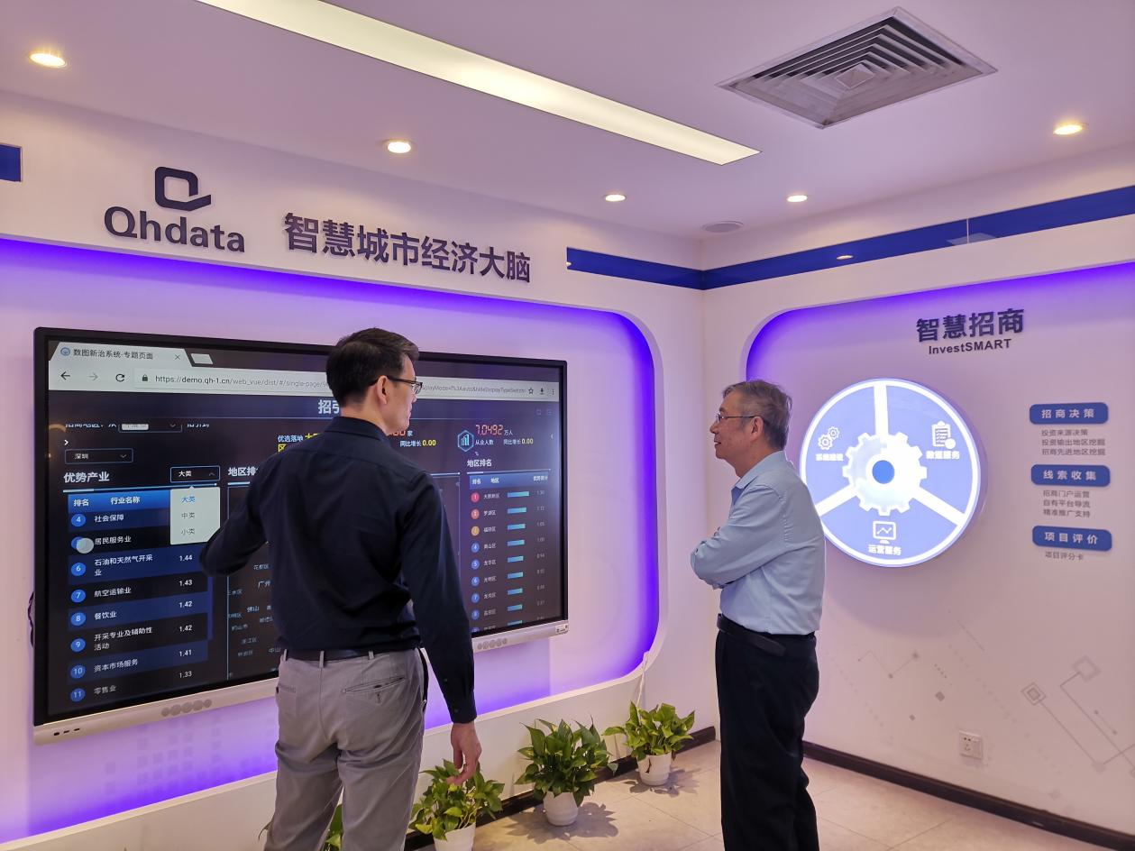 前海数据公司总经理苏毓腾向协会执行会长李蓟宁介绍前海数据智慧展厅
