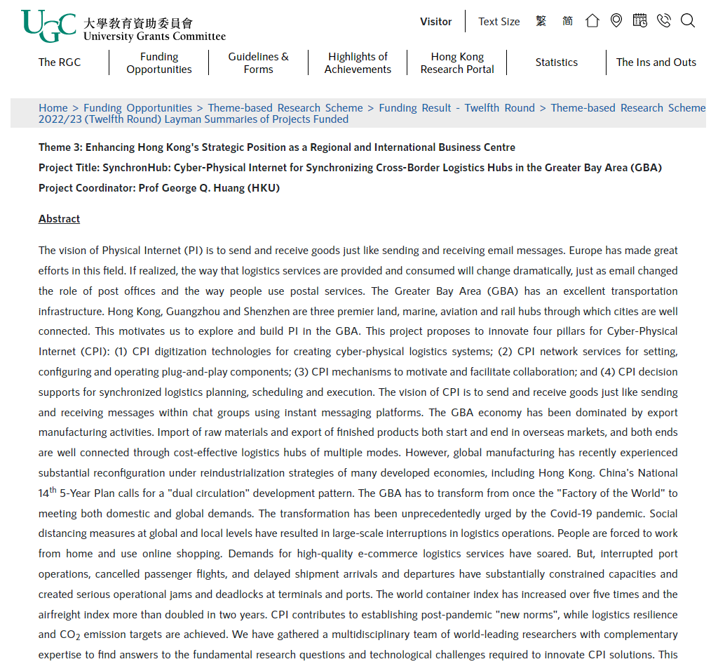 近日,香港大学工业与制造系统工程系主任、香港大学前海智慧交通研究院港大方面负责人黄国全教授担任课题负责人的主题研究方案“大湾区跨境物流枢纽互动智联网研究”入选香港研究资助局“2022/23主题研究方案”资助名单,资助金额4030万元港币。
