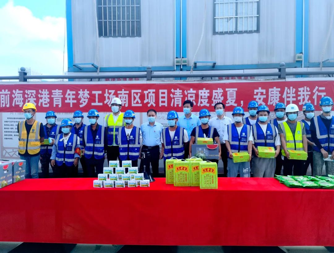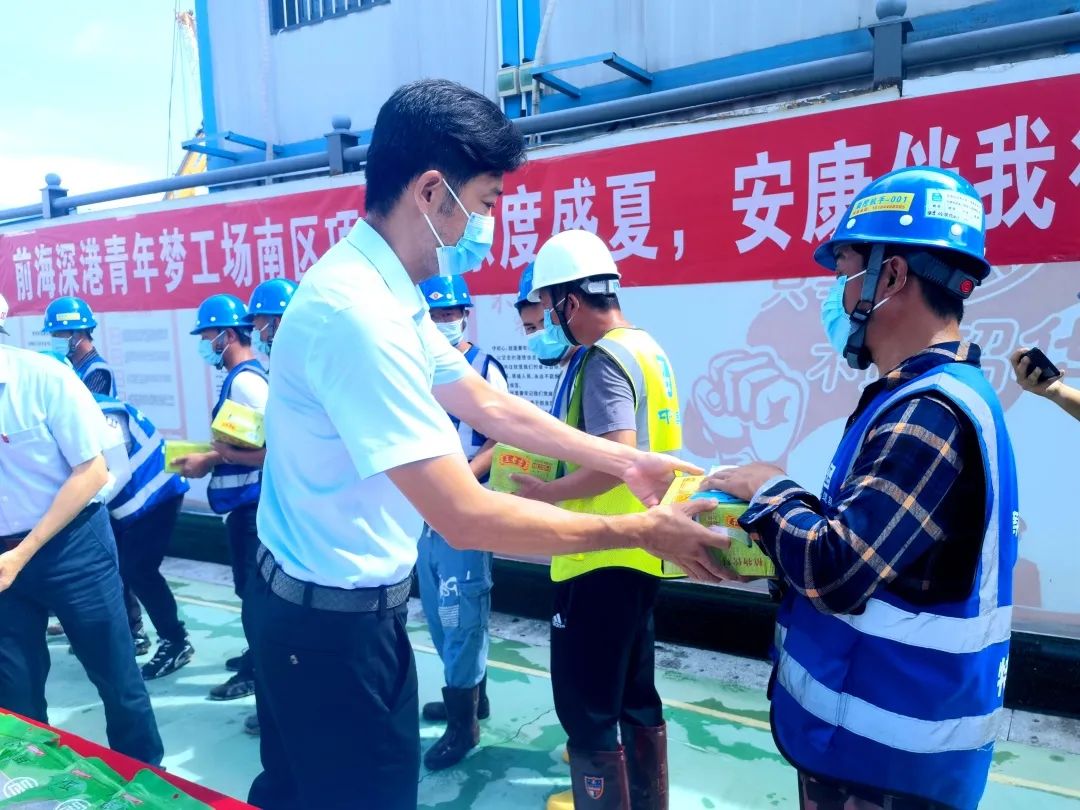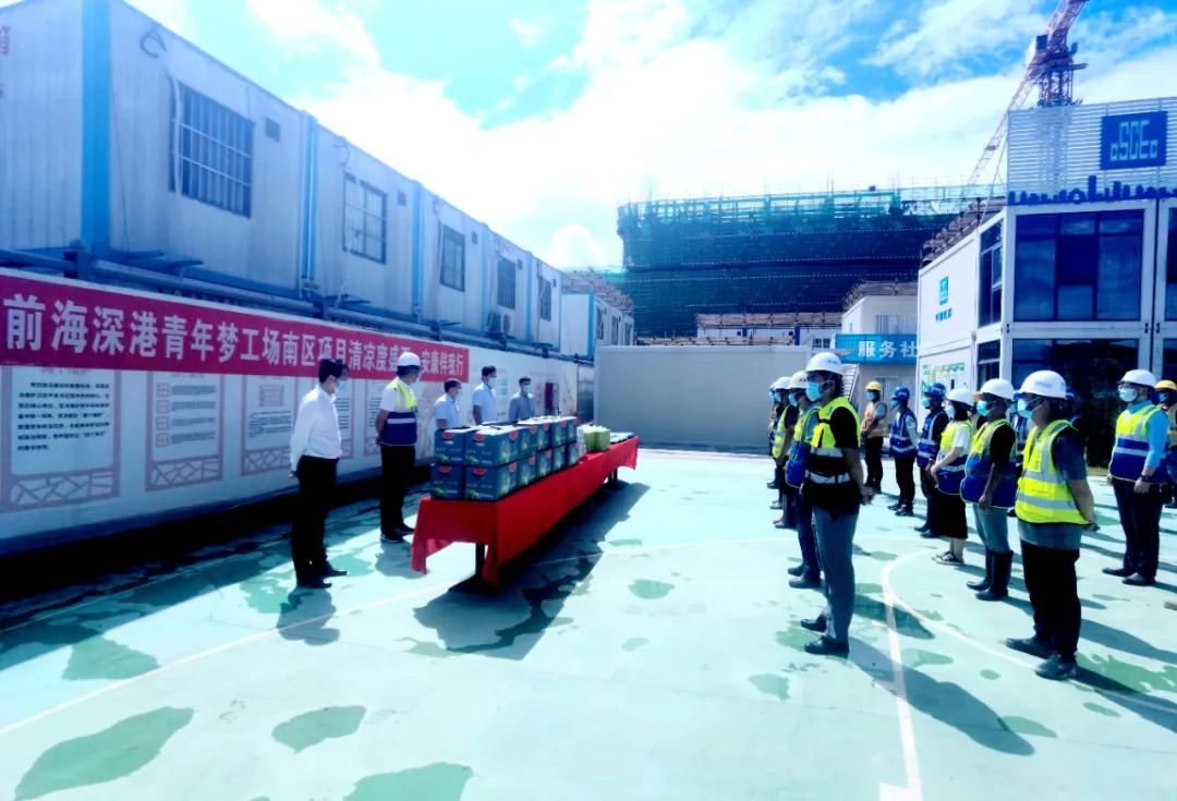 自今年暑期以来,深圳迎来了连续多日的高温天气。为了切实保障户外工作人员的健康安全和工作状态,防止炎热中暑,8月18日,前海服务集团党委书记、董事长陈卫,党委副书记、工会主席王悦赴梦工场北区二期、梦工场南区项目开展“清凉度盛夏、安康伴我行”活动,为奋战在生产一线的项目参建人员发放防暑降温用品。
