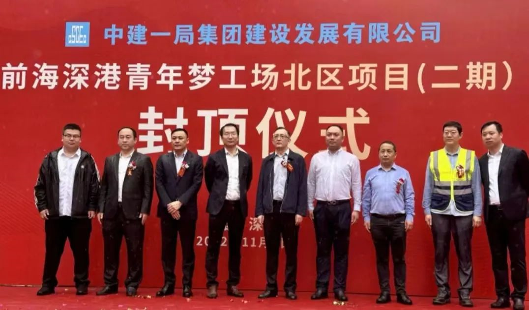 11月7日上午,前海深港青年梦工场北区二期项目举行主体结构封顶仪式。前海服务集团总经理许文运,中海发展代建事业部副总经理孟志鹏、项目总监芮国存以及各参建单位代表一同出席仪式。