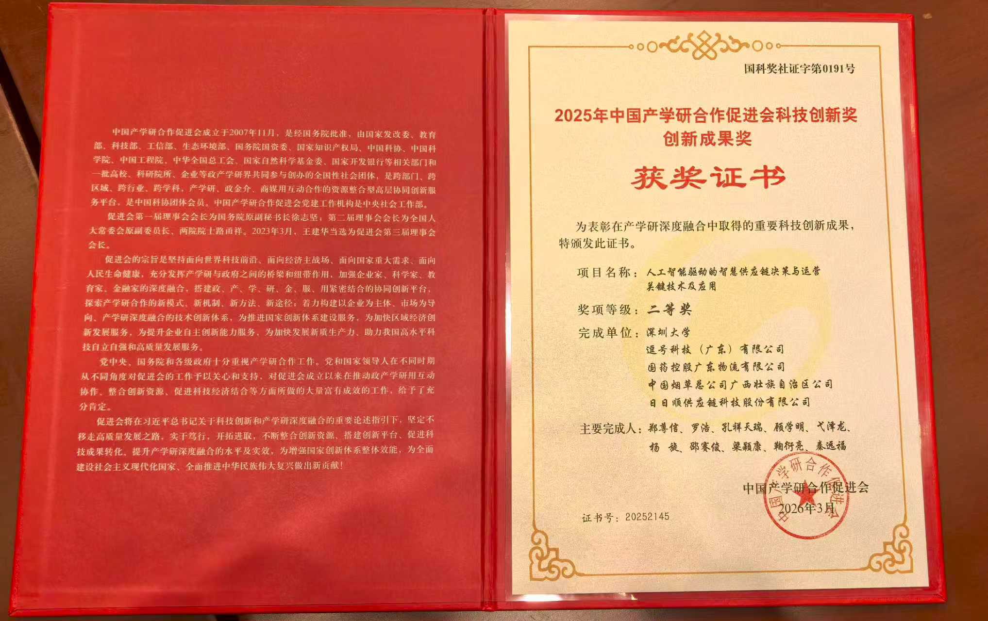 2026年3月15日,第十七届中国产学研合作创新大会在北京会议中心隆重举行。在这场汇聚了全国产学研界顶尖力量的高规格盛会上,前海深港青年梦工场在园企业——逗号科技(广东)有限公司联合深圳大学、国药控股广东物流有限公司、中国烟草总公司广西壮族自治区公司、日日顺供应链科技股份有限公司共同完成的《人工智能驱动的智慧供应链决策与运营关键技术及应用》项目,从众多参评成果中脱颖而出。荣获2025年中国产学研合作促进会科技创新奖?创新成果奖二等奖,展现了深港科创企业在硬科技赛道的强劲实力。